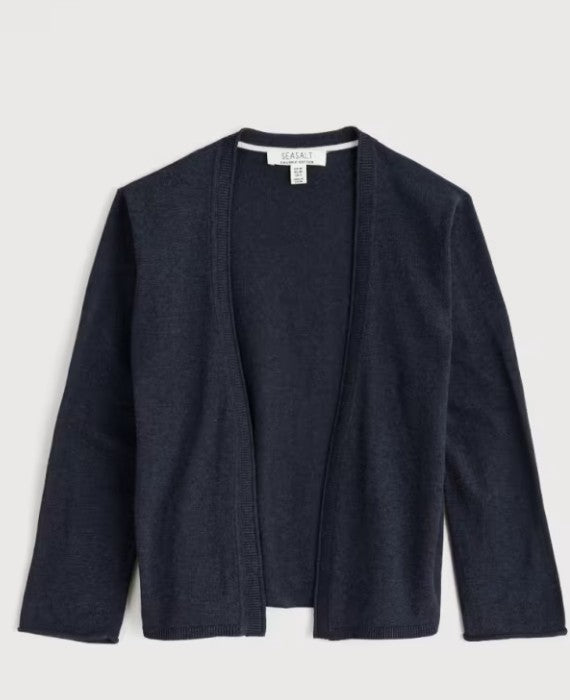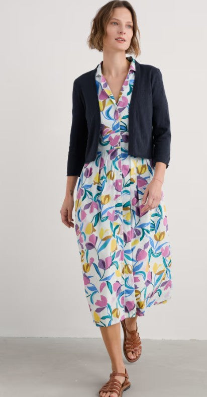 This little cardi is the perfect summer layer, it is a lightweight, semi fitted style that falls to the natural waist. Made from soft cotton with 3/4 length sleeves and a subtle rolled edge finish on the placket and cuffs for a feminine touch.