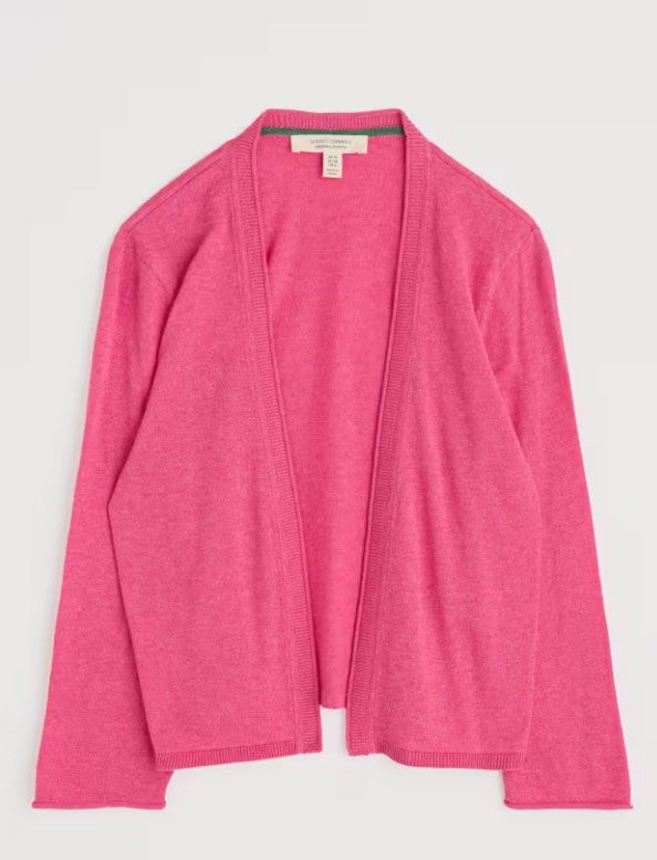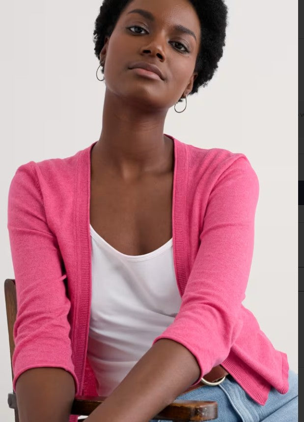 This little cardi is the perfect summer layer, it is a lightweight, semi fitted style that falls to the natural waist. Made from soft cotton with 3/4 length sleeves and a subtle rolled edge finish on the placket and cuffs for a feminine touch.