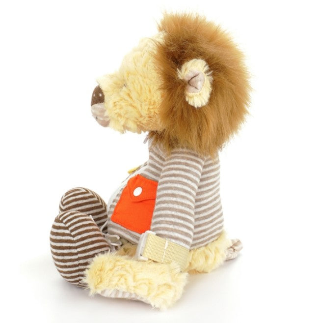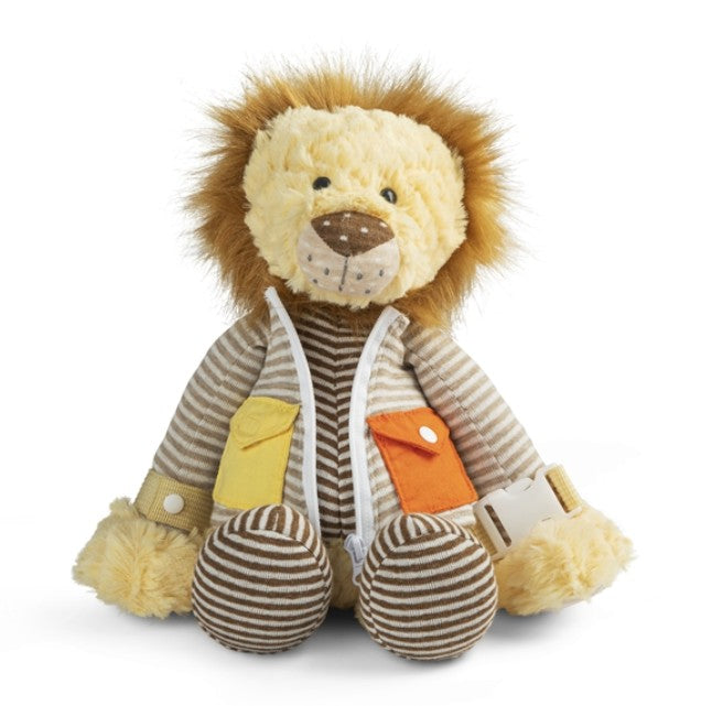 A plush lion with lots of bells and whistles to aid sensory development for toddler. This plush has buckles, snaps, Velcro and more to help toddler develop their senses and be more interactive during playtime.