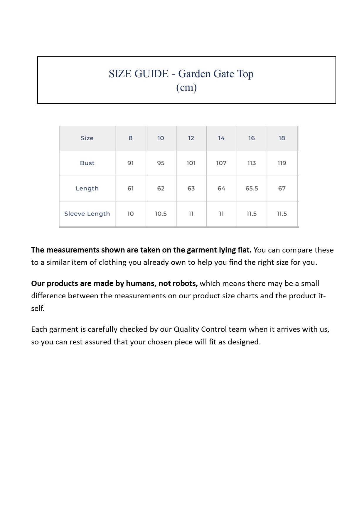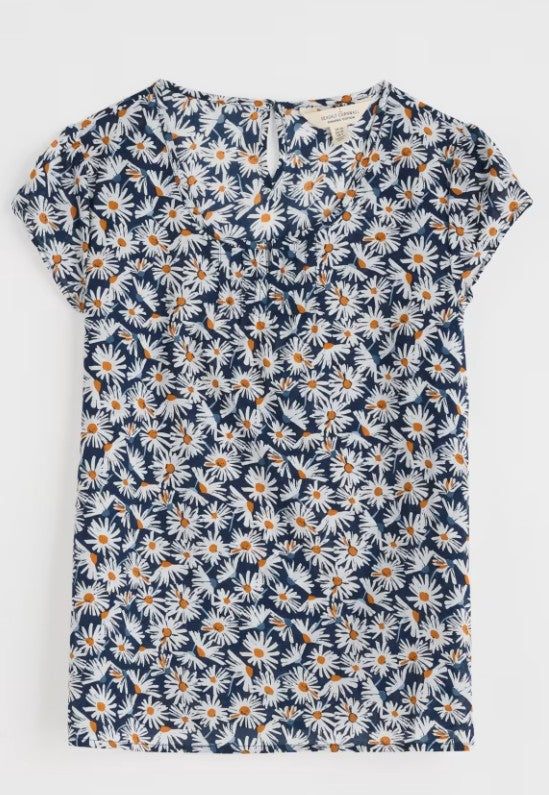 A pretty little top made from soft, cool cotton voile. Our Garden Gate top is semi-fitted with a scoop neck and cap sleeves. It's finished off with gentle gathers on the front to give it shape, and a keyhole opening with button loop fastening on the back.