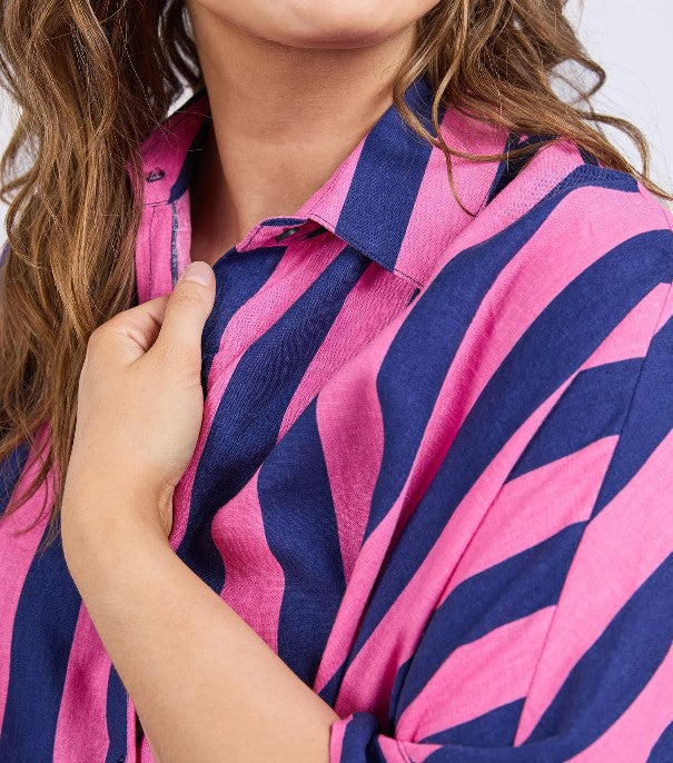 ELM's new favourite shirt comes in a striking blue and pink vertical stripe, bringing colour and ease to your wardrobe. With a classic button-through front, it’s perfect worn open over shorts or swimwear, or buttoned up and tucked in for a more polished look. The relaxed fit and feel make it an effortless go-to.