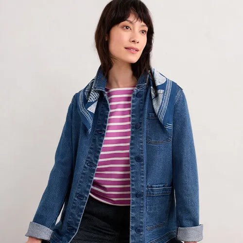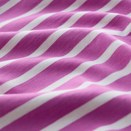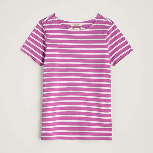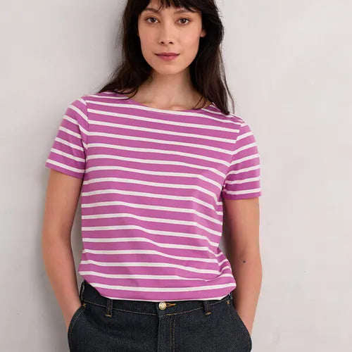 A gorgeous Tee with wide evenly spaced stripes inspired by Cornishware. A gorgeous pink and white Tee for a splash of fun in summer. Made from super soft organic cotton jersey, it has short sleeves and a flattering boat neck. Perfect to wear with just about anything.