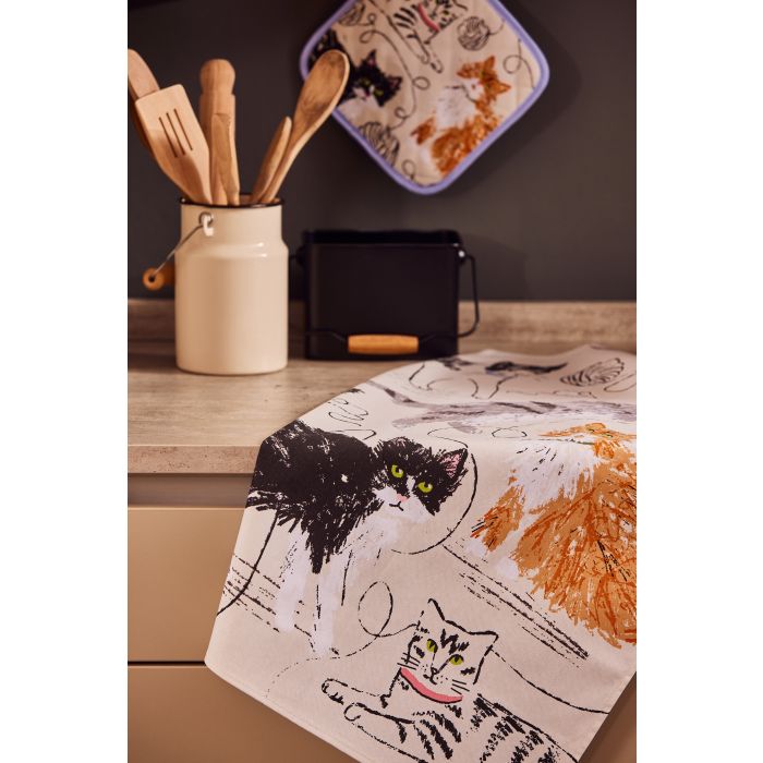 This Feline Friends Tea Towel celebrates your kitty companions while cooking, for yourself or entertaining friends and family! It features an ameow-sing collage of grey, orange and black cats playing around with yarn.